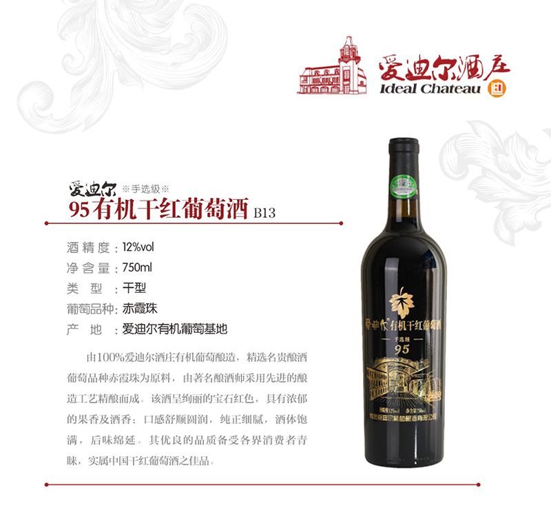 B13有机干红葡萄酒由100%爱迪尔酒庄有机葡萄酿造,精选欧洲名贵酿酒葡萄品种赤霞珠为原料,由著名酿酒师采用先进的工艺技术控温发酵并用橡木桶藏酿而成,并在常年恒温(15℃)的爱迪尔地下大酒窖瓶贮7年以上。创造了爱迪尔酒庄有机干红葡萄酒的独特、高雅的品位,品质卓越,尽显尊荣,实乃名酒中的珍藏版。