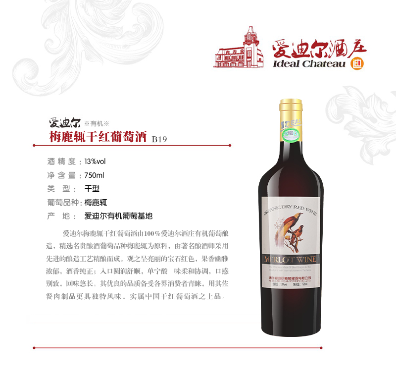 爱迪尔太阳鸟梅鹿辄有机干红葡萄酒,原生态的栽培环境,纯有机的种植方式,完美地保留了葡萄的营养成分,有效的提高了葡萄酒的高贵品质。美丽的宝石红色,有着纯正自然果香、酒香,口味醇厚和谐,美妙无比。