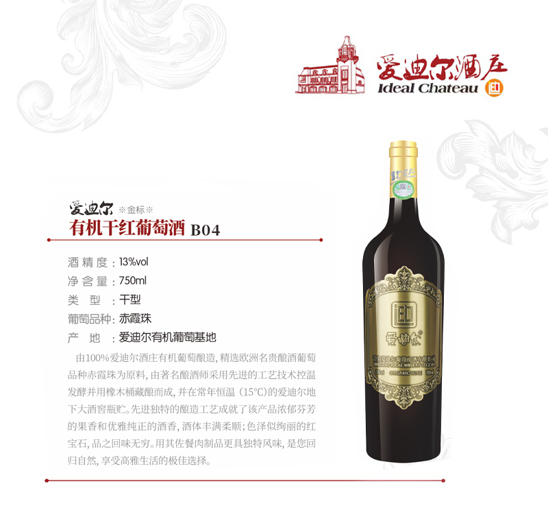 赤霞珠干红葡萄酒由 100%爱迪尔酒庄有机葡萄酿造,精选欧洲名贵酿酒葡萄品种赤霞珠为原料,由著名酿酒师采用先进的工艺技术控温发酵并用橡木桶藏酿而成,并在常年恒温 (15℃)的爱迪尔地下大酒窖瓶贮3年以上。先进独特的酿造工艺成就了该产品浓郁芬芳的果香和优雅纯正的酒香,酒体丰满柔顺;色泽似绚丽的红宝石,品之回 味无穷。用其佐餐肉制品更具独特风味,是您回归自然,享受高雅生活的极佳选择。